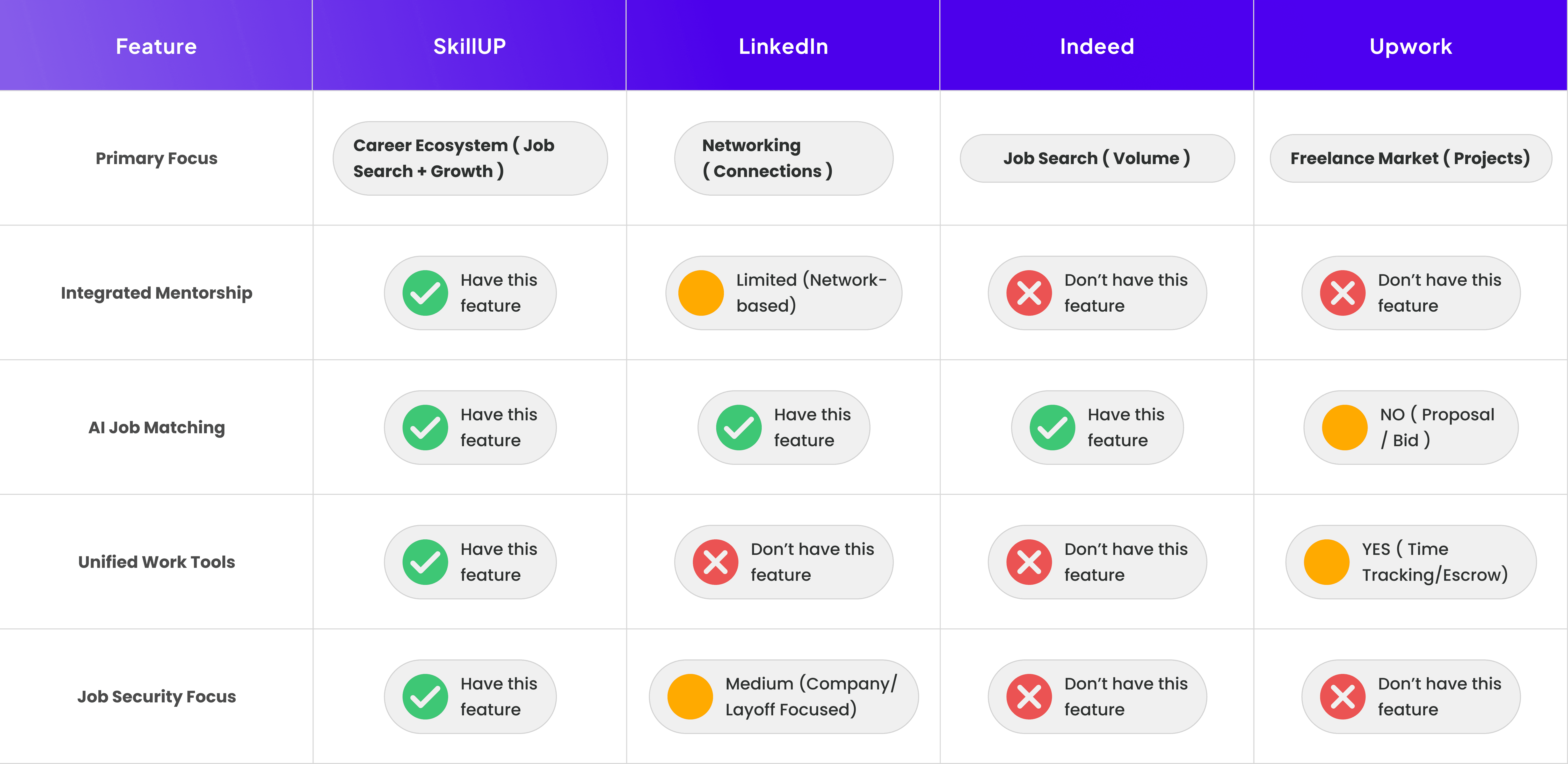 To learn about the existing products in this related field, I researched about the features and trade-offs in the competitors and mapped down where they lack and what copuld be improved in the SkillUp