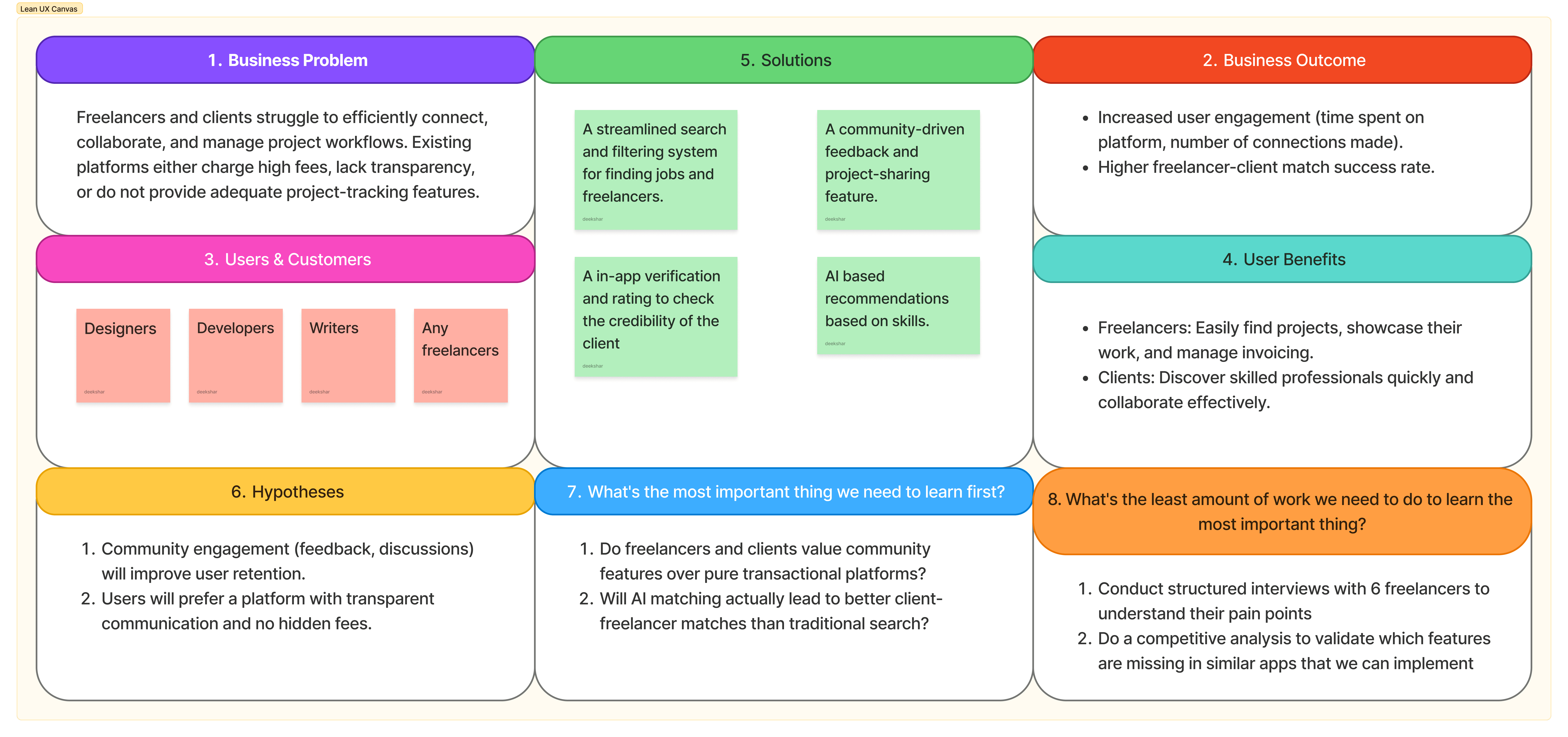 To understand the business value of the product and to prevent myself from building features that nobody needs, I did the Lean UX Canvas to validate ideas early and saving time and resources.